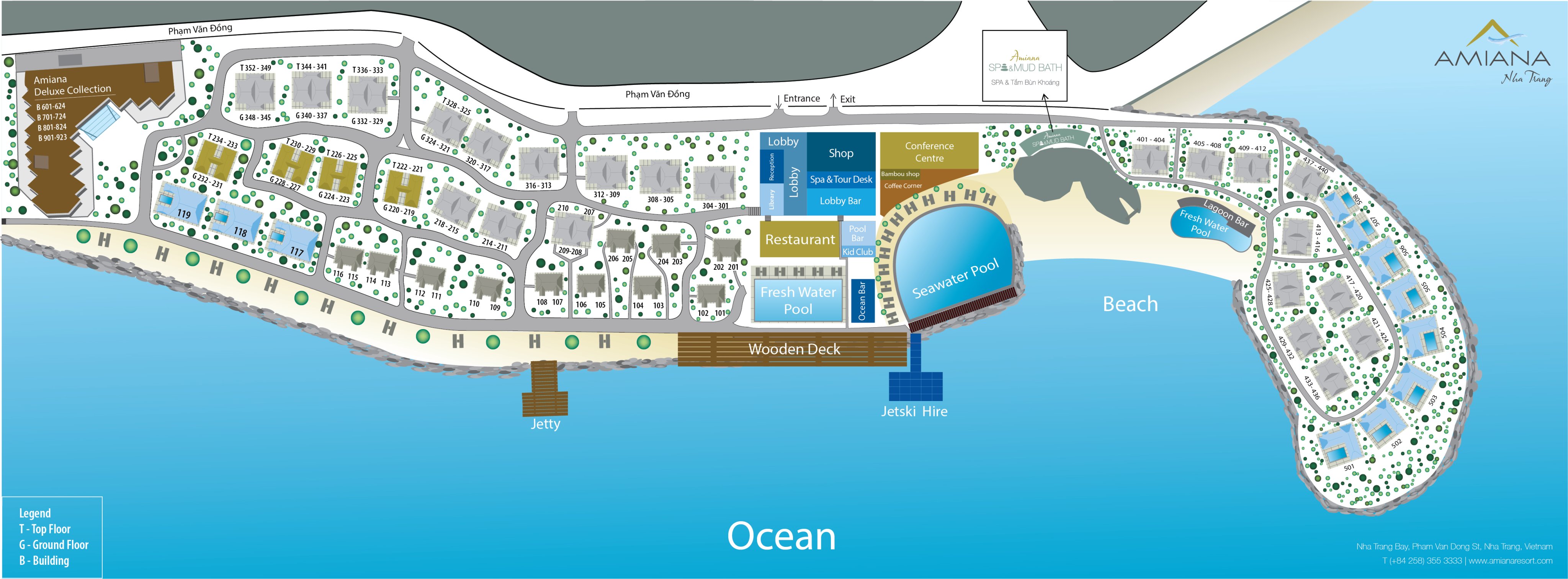 Amiana Resort & Villas Nha Trang расположен в уединённой бухте в 8 км от центра Нячанга. В центре курорта находится бассейн с морской водой площадью 2500 м², также к услугам гостей два пейзажных бассейна с пресной водой площадью 600 и 700 м² и частный пляж в форме лагуны. В отеле есть спа-центр с природными грязевыми ваннами, тренажёрный зал и центр водных видов спорта.