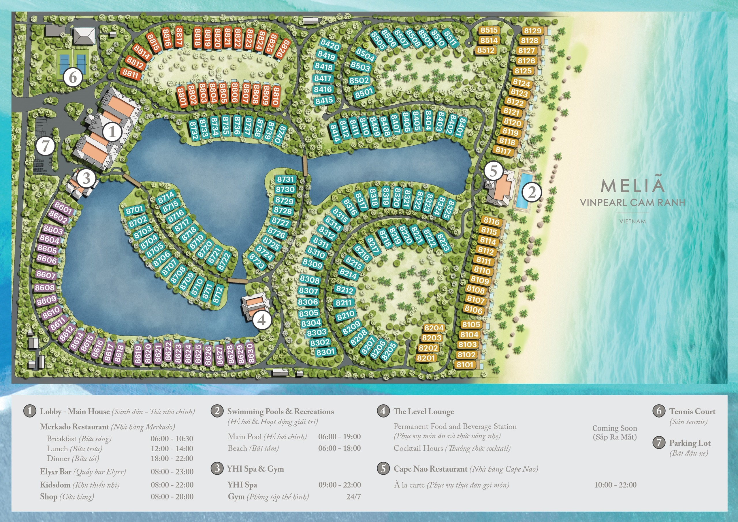 Melia Vinpearl Cam Ranh Beach Resort расположен на пляже Long Beach и состоит из основного здания и комплекса одно и двух-этажных вилл. Все виллы спроектированы так, чтобы обеспечить уединение и отдых и оснащены собственным бассейном, а из окон открывается вид на озеро или море. К услугам гостей отеля открытый бассейн, теннисный корт, спа-центр, детский клуб и частный песчаный пляж.