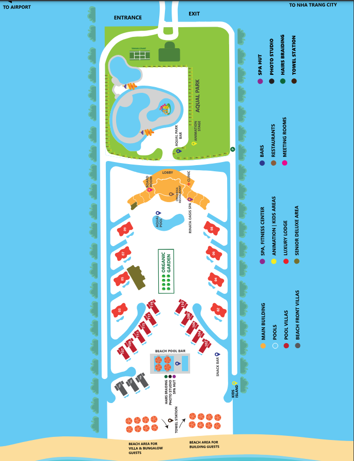 Cam Ranh Riviera Beach Resort & Spa расположен на первой береговой линии и состоит из одного основного 10 этажного здания и комплекса коттеджей и вилл. На территории отеля 2 открытых бассейн, есть аквапарк с водными горками для взрослых и детей, спа-центр, детский клуб и конференц-залы. К услугам гостей активная анимационная программа, частный пляж, а также бесплатный трансфер до торгового центра в Нячанге.