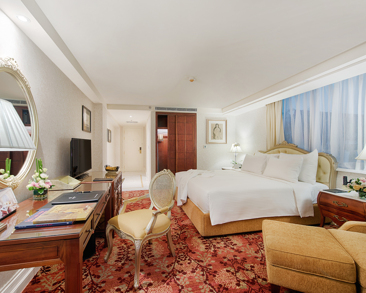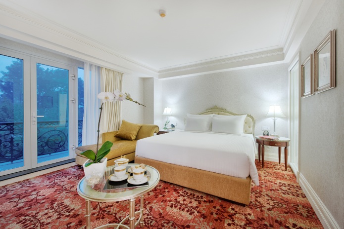 Номер премиум-класса на верхних этажах отеля: отдельная спальня с двуспальной кроватью king size, отдельная гостиная, отдельная ванная комната со c душевой кабиной; в части номеров – меблированная терраса и собственный небольшой сад, вид на город с высокой точки;