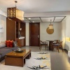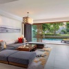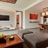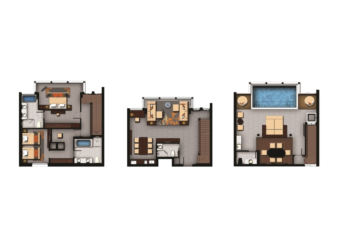 Люкс с 2-мя спальнями: одна – с двуспальной кроватью king size, вторая – с 2-мя односпальными кроватями; 2 ванные комнаты, каждая с ванной и душем; отдельная гостиная с зоной отдыха, обеденной зоной на 6 персон и мини-кухней с раковиной и микроволновой печью, меблированная терраса с обеденной зоной на открытом воздухе (на 4 персоны), частный бассейн, вид на территорию курорта; план номера;