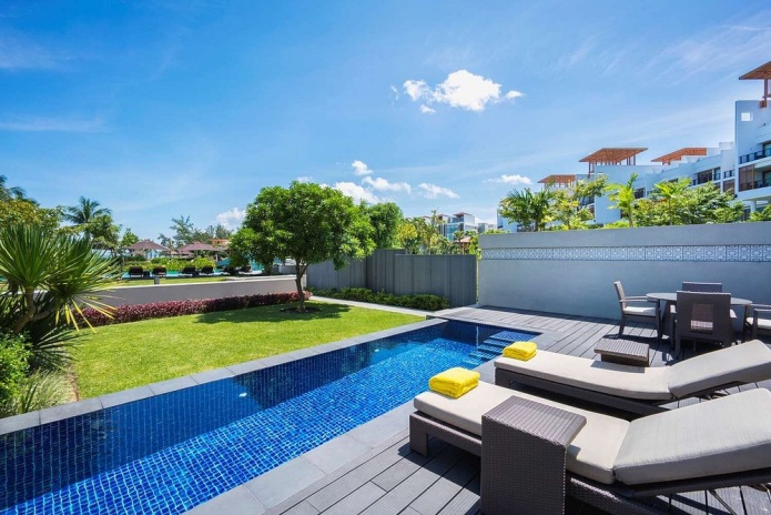 Люкс с 2-мя спальнями на берегу моря, одна спальня с двуспальной кроватью king size, вторая – с 2-мя односпальными кроватями; 2 ванные комнаты, каждая с ванной и душем; отдельная гостиная с зоной отдыха, обеденной зоной на 6 персон и мини-кухней с раковиной и микроволновой печью, меблированная терраса с обеденной зоной на открытом воздухе (на 4 персоны), сад, частный бассейн, прямой доступ к пляжу; план номера;