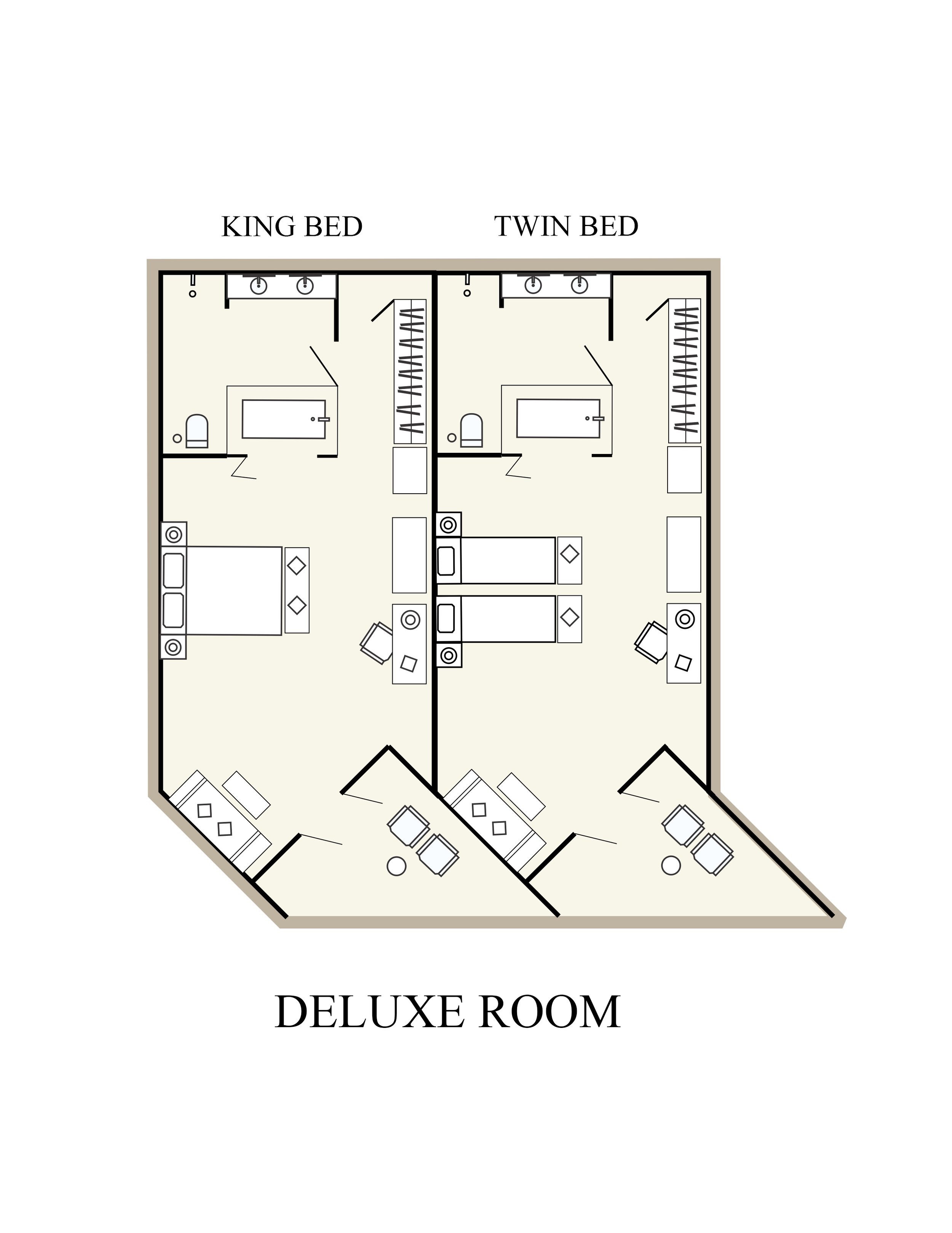 - 88 номеров Deluxe Room (55 м², макс. 3 или 2+2).