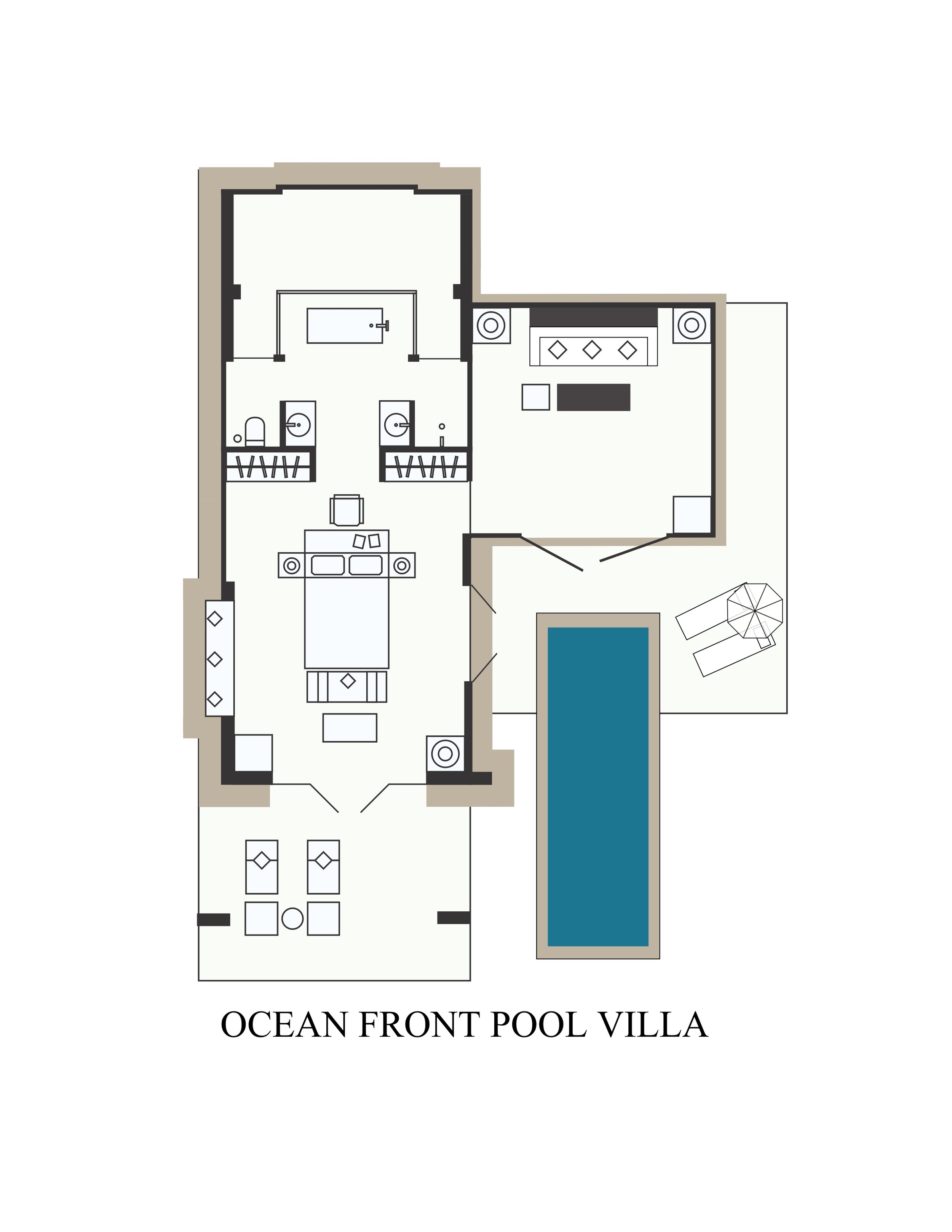Спальня с двуспальной кроватью king-size, отдельная гостиная комната с диваном, ванная комната с ванной и душем, терраса с лежаками, персональный бассейн (20 м²), панорамный вид на океан, спасательные жилеты, см.план номера;