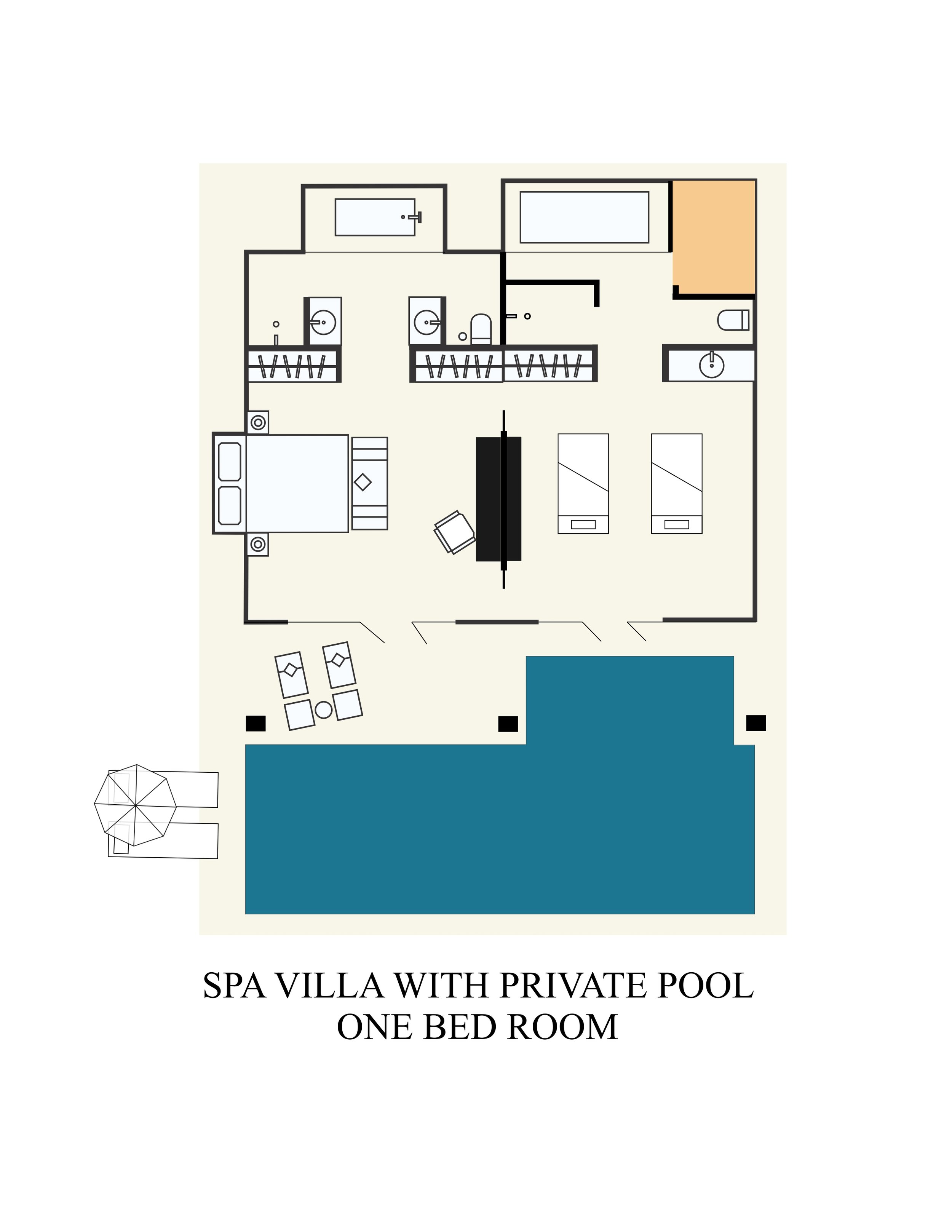 Спальня с двуспальной кроватью king-size, ванная комната с ванной и душем, комната для спа-процедур с сауной, парной и джакузи, терраса с лежаками, персональный бассейн (40 м²), спасательные жилеты, см.план номера;