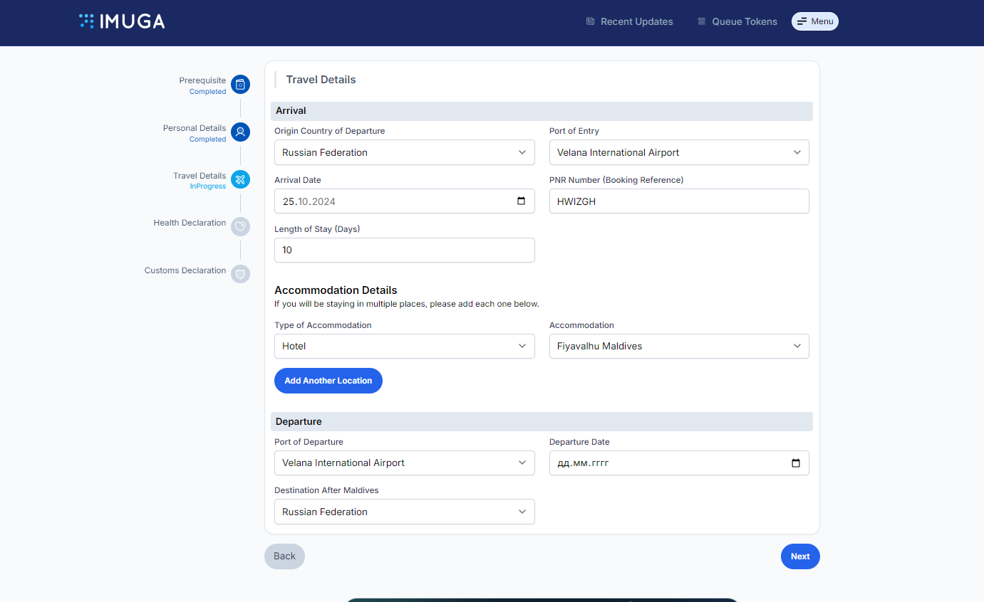 следующий шаг – заполнение полётных данных на вылет: аэропорт прилёта, дата въезда в страну, продолжительность отдыха в днях, страна отправления, номер бронирования в авиакомпании, отель/остров, где турист планирует жить; а также данных на возврат: аэропорт и дата вылета, следующая страна назначения после Мальдив (например, Russian Federation). Кнопка Next для перехода к следующей странице.