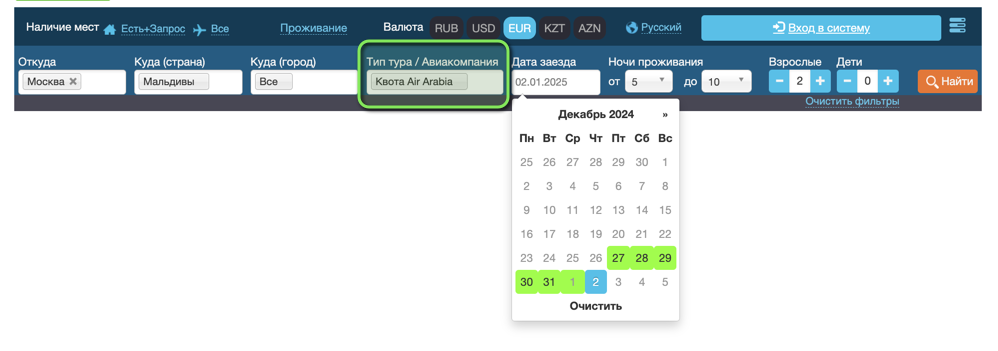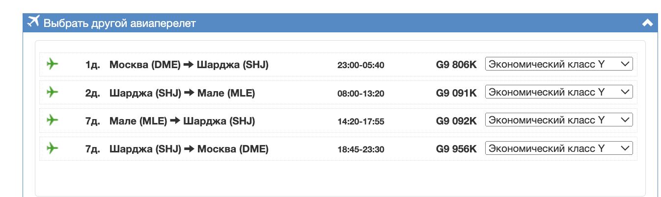 Обращаем ваше внимание, что в нашей системе онлайн-бронирования можно выбрать и забронировать туры на Мальдивы с гарантированным перелётом а/к Air Arabia (актуализация не требуется).