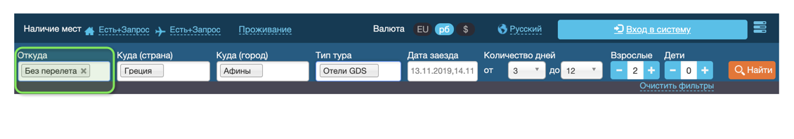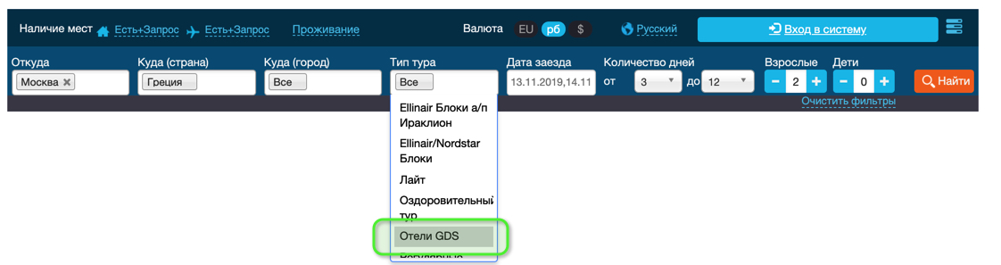 Обратите внимание, что в системе онлайн-бронирования по направлениям Турция – Стамбул и Греция – Афины появился новый тип тура – «Отели GDS».