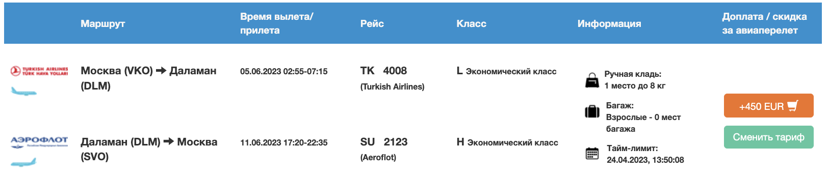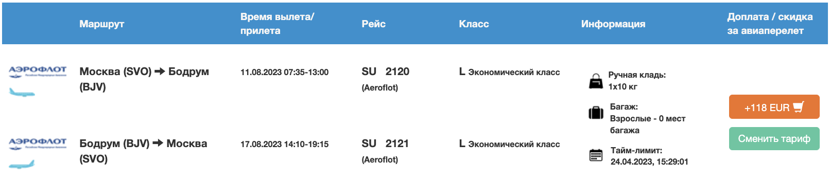 По кнопке «Сменить тариф» можно выбрать тариф с багажом.