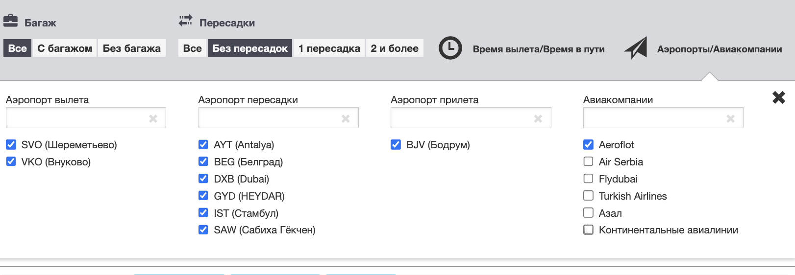 В окне актуализации выбирайте фильтры «Без пересадок» и «Авиакомпания». Также очень полезен фильтр «Время вылета/прилёта».