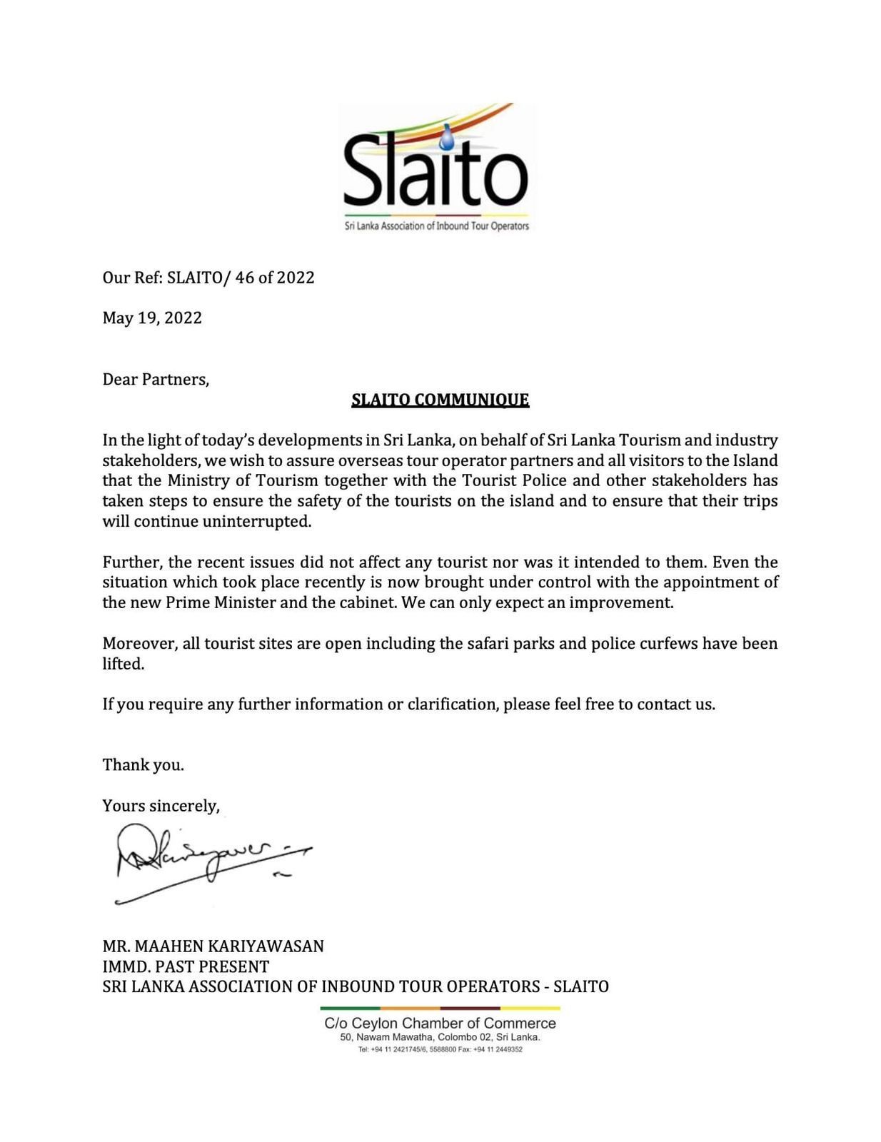 Ассоциация туроператоров Шри-Ланки распространила заявление, в котором сообщается о том, что министерство туризма страны вместе с туристической полицией и другими ведомствами предприняли все необходимые шаги, чтобы гарантировать безопасность туристов во время отдыха. Планированию поездок и отдыху туристов ничего не препятствует.